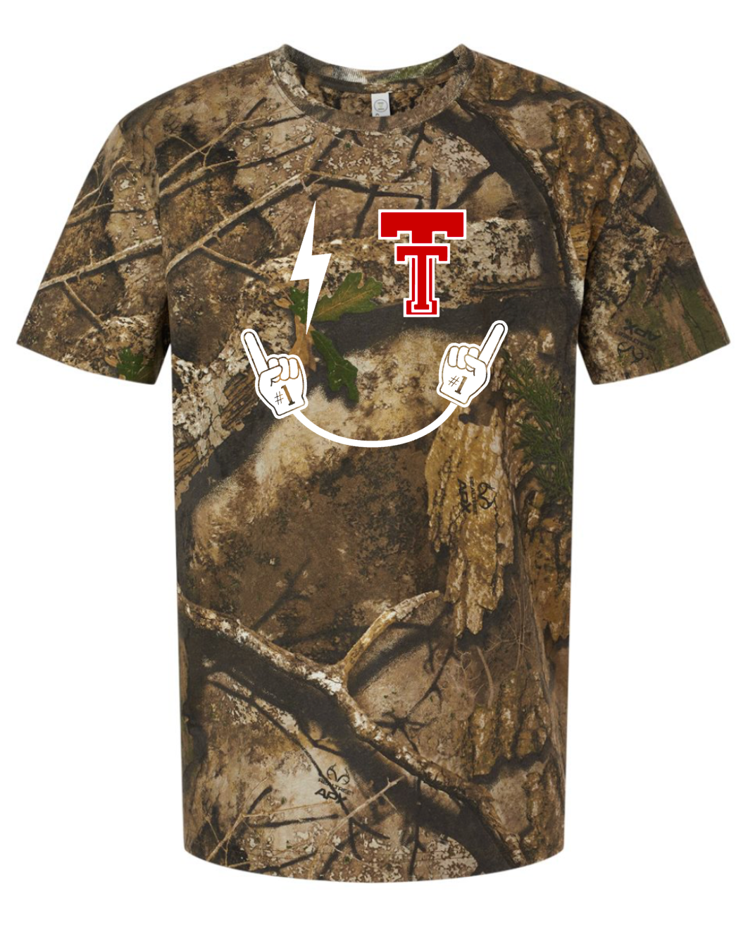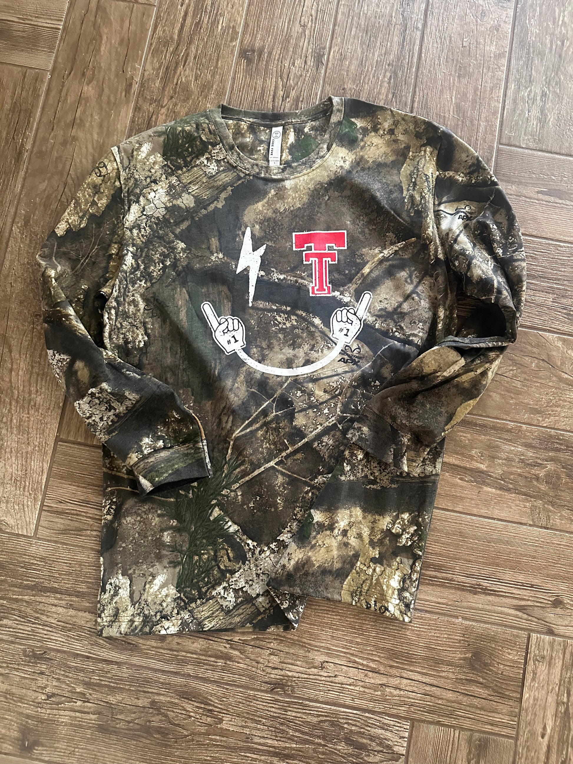 Smiley face Tech design on your choice of sweatshirt, tee, crop, or camo!