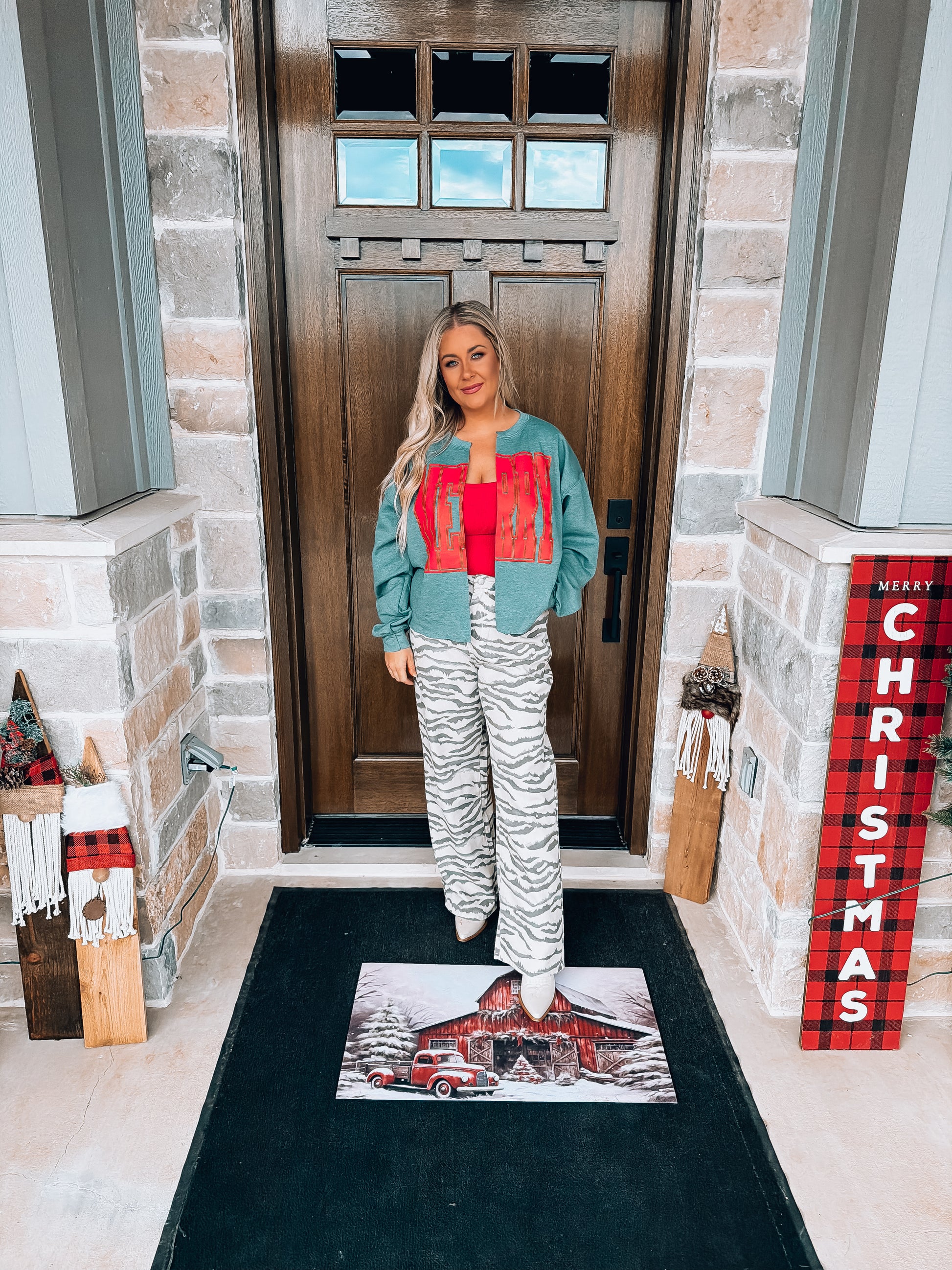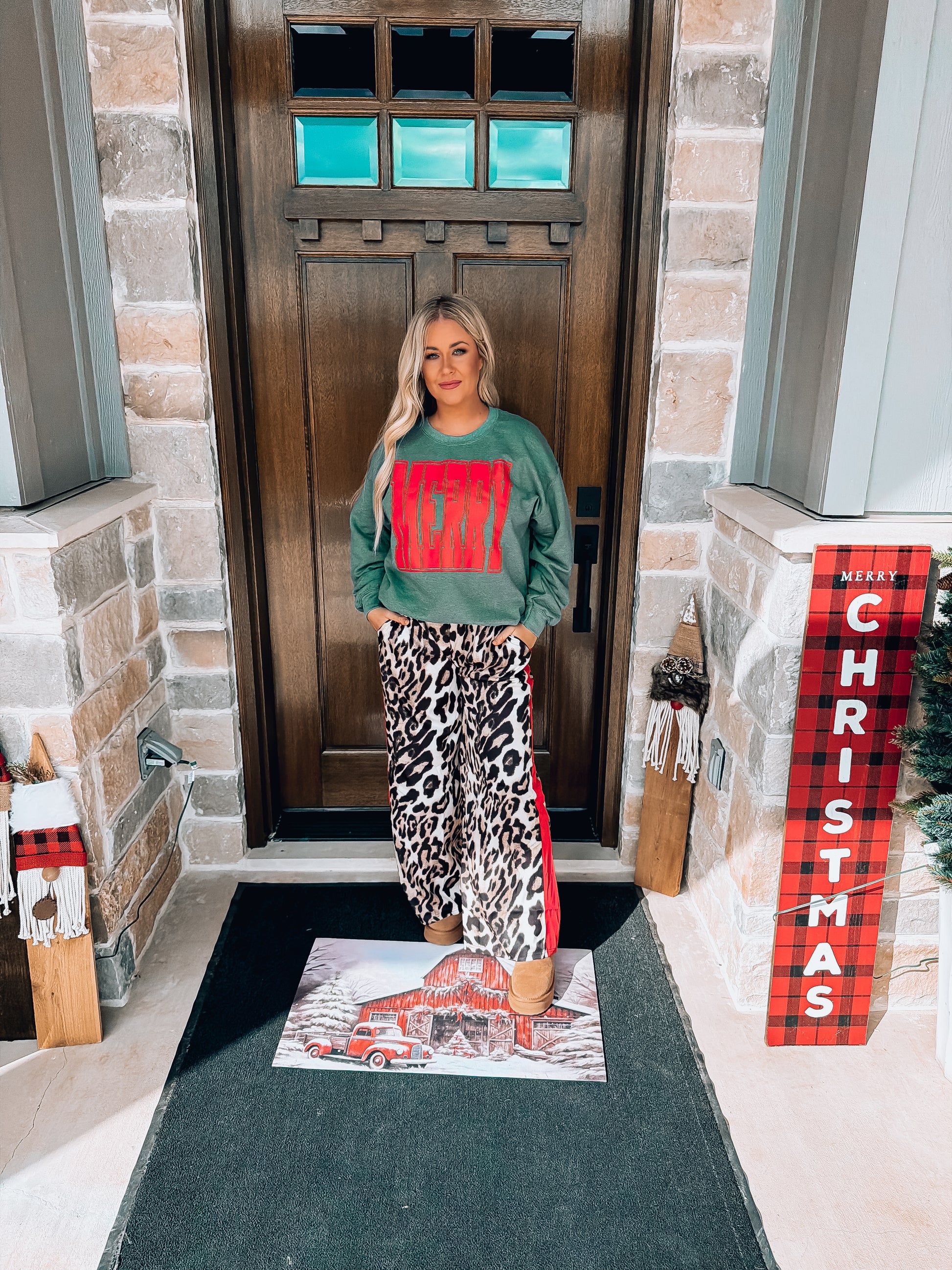 Large MERRY varsity style sweatshirt on heathered green. Unisex sizing.